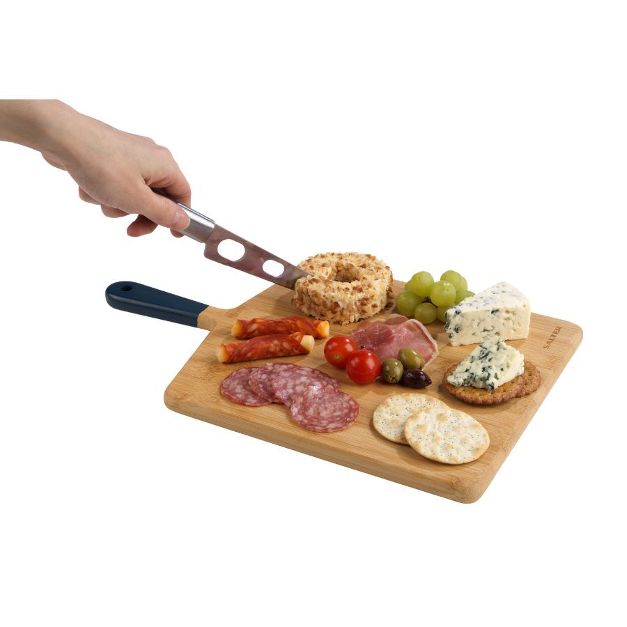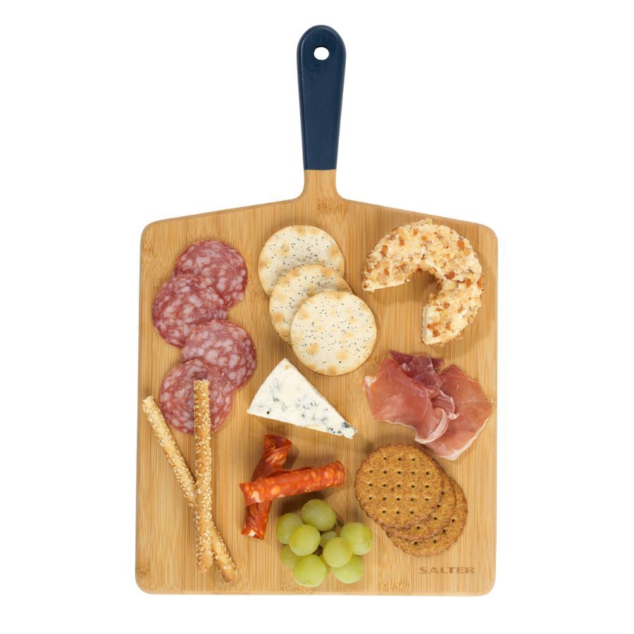 Ideal for preparing and serving all types of food, this Salter Indigo Chopping Board is a perfect addition to any kitchen. Crafted from bamboo, the board is strong and durable which is ideal for chopping a range of ingredients and serving foods such as cheese and meats. Measuring 39.5 x 25 x 1.5cm the board features they an easy-grip handle which is ideal for carrying food to the table or for serving guests and a hanging loop at the end of the handle for convenient storage.
