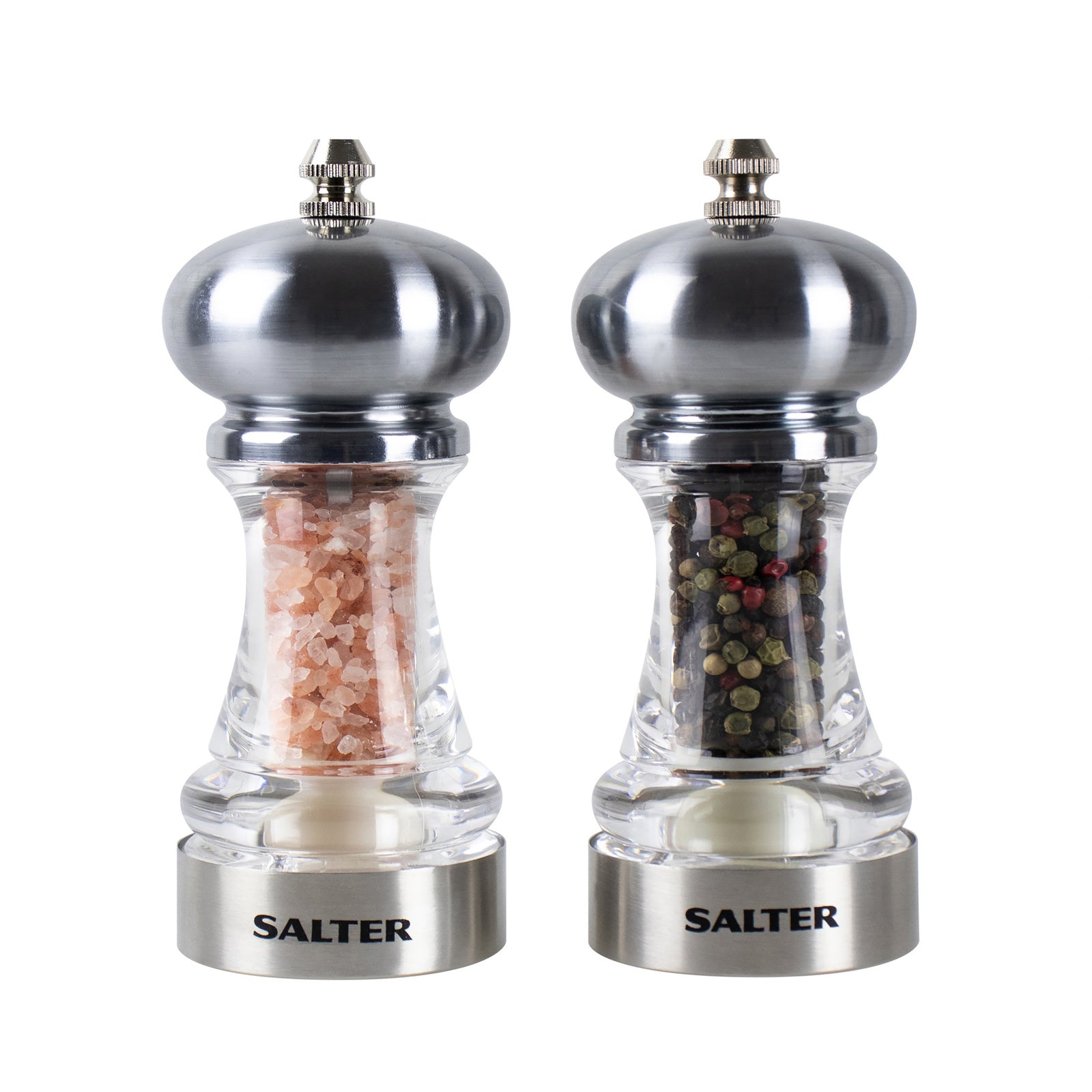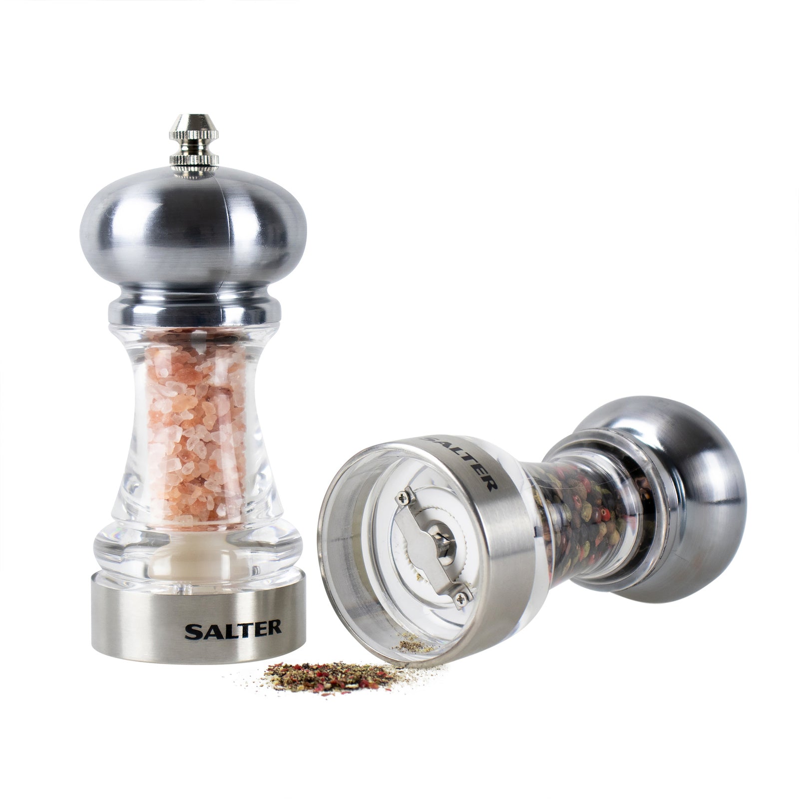 Add style to your dinner table or while serving food outside at a barbecue. The classic and timeless design, paired with the unparalleled quality of Salter makes these stainless-steel mills a must-have, everyday cooking tool in any kitchen. Ideal for people who enjoy the taste of freshly ground pepper with their meals, these mills feature a diamond hard ceramic for sharper and harder than steel for superior grinding. With an easy adjustable grind that allows you to set fineness from coarse to fine to meet your different needs in seconds, youll be able to distribute the right amount of salt and pepper with perfect accuracy. The crystal-clear acrylic is not only durable, easy to clean, and shows when refilling is needed. The Salter Stainless Steel Mills will add style to any table whilst remaining an everyday kitchen tool.