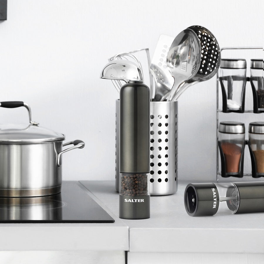Salter 7538 GMXR Rechargeable Salt and Pepper Mills with USB Cable, Easy One Hand Operation, Ceramic Mechanism, Adjustable Grind from Fine to Corse, Gunmetal Stainless Steel Finish
